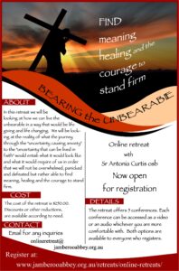 In this retreat, Bearing the Unbearable, we will be looking at how we can live the unbearable in a way that would be life giving and life changing. We will be looking at the reality of what the journey through the “uncertainty causing anxiety” to the “uncertainty that can be lived in faith” would entail: what it would look like and what it would require of us in order that we will not be overwhelmed, panicked and defeated but rather able to find meaning, healing and the courage to stand firm.