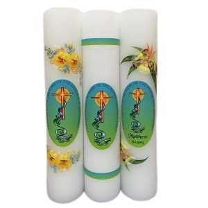 The sticker has an option of general sticker or you may add name and date of baptism. Please choose the decoration between yellow flower, yellow native or top and bottom bands.