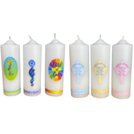 This is a box of 24 baptism candles with bottom band. The box can consist of all the same design and colour or a mix. The available designs are General (Blue, Pink, Yellow), Water Green, Water Blue and Rainbow.