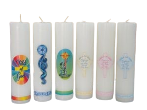 This is a box of 24 baptism candles with bottom band. The box can consist of all the same design and colour or a mix. The available designs are General (Blue, Pink, Yellow), Water Green, Water Blue and Rainbow.