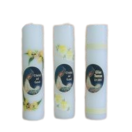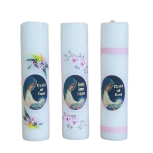 A baptism candle with Marian theme. The candle will have your child’s name and baptism date.